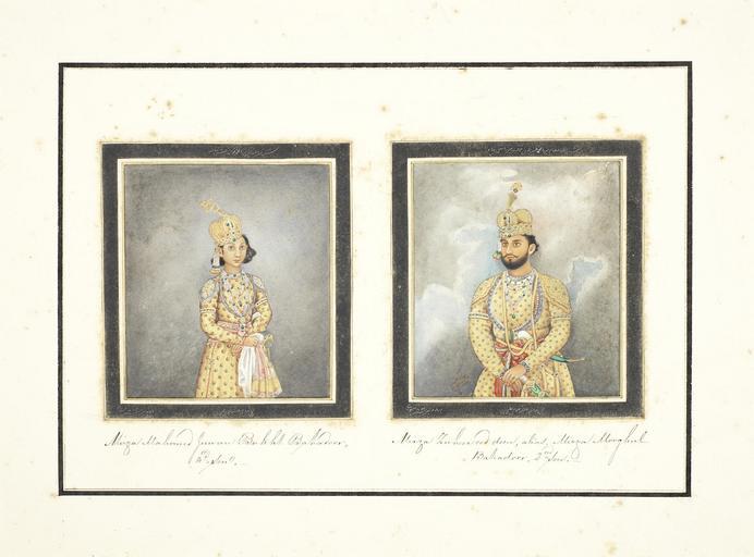 | Keywords: Ghulam Ali Khan 016.jpg Two portraits Mirza Mahomed Juwan Bakht Bahadoor 3d son; Mirza Zuheer ood deen alias Mirza Mooghul Bahadur 2nd Son Mirza Muhammad Zahir al-Islam known as Mirza Mughul Bahador on the right and Mirza Muhammad Javan Bakht Bahadur on the left both signed by Ghulam 'Ali Khan A series of 31 paintings by Ghulam Ali Khan fl 1817-55 consisting of views of monuments in and around Delhi and including four portraits of the last Mughal Emperor Bahadur Shah II reg 1837-58 and his sons Watercolour and gold on paper black margin rules three title pages three sheets of portraits all with identifying inscriptions in English and in Persian in nasta'liq script in black ink the portraits with further inscriptions in nasta'liq script with the date November 1852 Christian date written in Arabic in later mounts loose in contemporary green leather-covered despatch box the lid embossed in gold DELHEE 1854 Size paintings 290 x 215 mm and slightly smaller; mounts 318 x 394 mm ; box 435 x 365 x 110 mm http //www bonhams com/auctions/20833/lot/352/ 1852-11 Ghulam Ali Khan 100px 100px PD-Art-100 Sketches of The Delhee Palace Delhee 1854 |