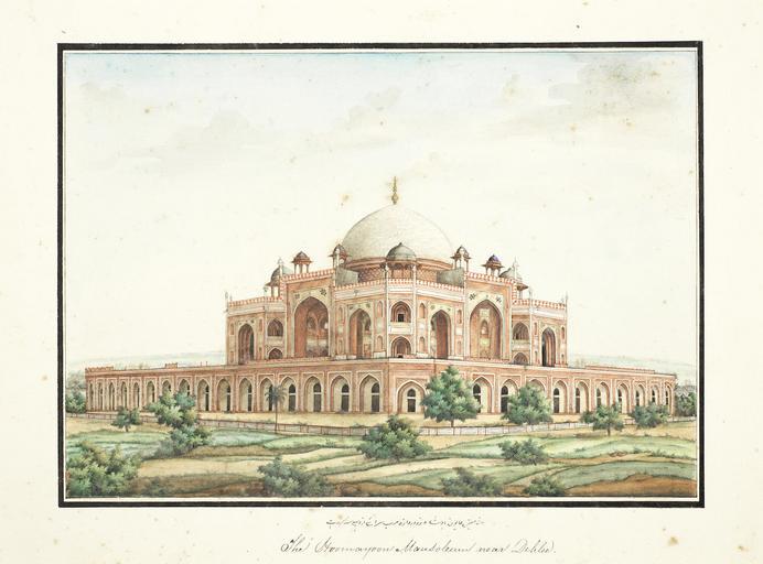 Keywords: Ghulam Ali Khan 028.jpg The Hoomayoon Mausoleum near Delhee Humayun's tomb from Arab Sarai side A series of 31 paintings by Ghulam Ali Khan fl 1817-55 consisting of views of monuments in and around Delhi and including four portraits of the last Mughal Emperor Bahadur Shah II reg 1837-58 and his sons Watercolour and gold on paper black margin rules three title pages three sheets of portraits all with identifying inscriptions in English and in Persian in nasta'liq script in black ink the portraits with further inscriptions in nasta'liq script with the date November 1852 Christian date written in Arabic in later mounts loose in contemporary green leather-covered despatch box the lid embossed in gold DELHEE 1854 Size paintings 290 x 215 mm and slightly smaller; mounts 318 x 394 mm ; box 435 x 365 x 110 mm http //www bonhams com/auctions/20833/lot/352/ circa 1852 1854 Ghulam Ali Khan PD-Art-100 Sketches of The Delhee Palace Delhee 1854 Main monument Humayun's Tomb |