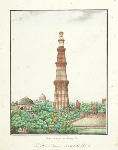 Keywords: Ghulam Ali Khan 031.jpg The Kootub Minar - 11 miles South of Delhee The minaret of Khwaja Qutb al-Din Qutub Minar together with the tomb of Adham and the Qutub Gate A series of 31 paintings by Ghulam Ali Khan fl 1817-55 consisting of views of monuments in and around Delhi and including four portraits of the last Mughal Emperor Bahadur Shah II reg 1837-58 and his sons Watercolour and gold on paper black margin rules three title pages three sheets of portraits all with identifying inscriptions in English and in Persian in nasta'liq script in black ink the portraits with further inscriptions in nasta'liq script with the date November 1852 Christian date written in Arabic in later mounts loose in contemporary green leather-covered despatch box the lid embossed in gold DELHEE 1854 Size paintings 290 x 215 mm and slightly smaller; mounts 318 x 394 mm ; box 435 x 365 x 110 mm http //www bonhams com/auctions/20833/lot/352/ circa 1852 1854 Ghulam Ali Khan PD-Art-100 Sketches of The Delhee Palace Delhee 1854 Qutb Minar in art |