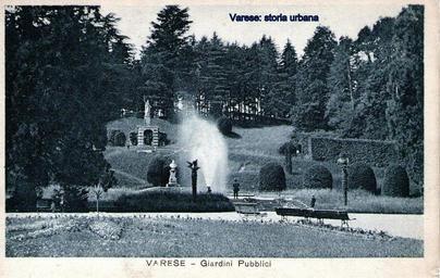 Keywords: Vista del parterre. Alle spalle della fontana centrale il busto di Umberto I. La fontana superiore, il "grottesco" (1767-69) è sormontata dalla statua dell'Italia liberata. varese giardinipubblici