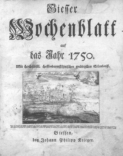 Keywords: Gießen 1750.jpg de Titelseite des Ankündigungstextes für das Gießener Wochenblatt Bingsohn Wilhelm; Stadt im Territorium 17 und 18 Jahrhundert in 800 Jahre Gießener Geschichte 1197-1997 Brühlscher Verlag Gießen S 88 dort vom Gießener Anzeiger 1750 Gießener Wochenblatt PD-old-100 Gießen 1750 Periodicals of Germany Giesser Wochenblatt |