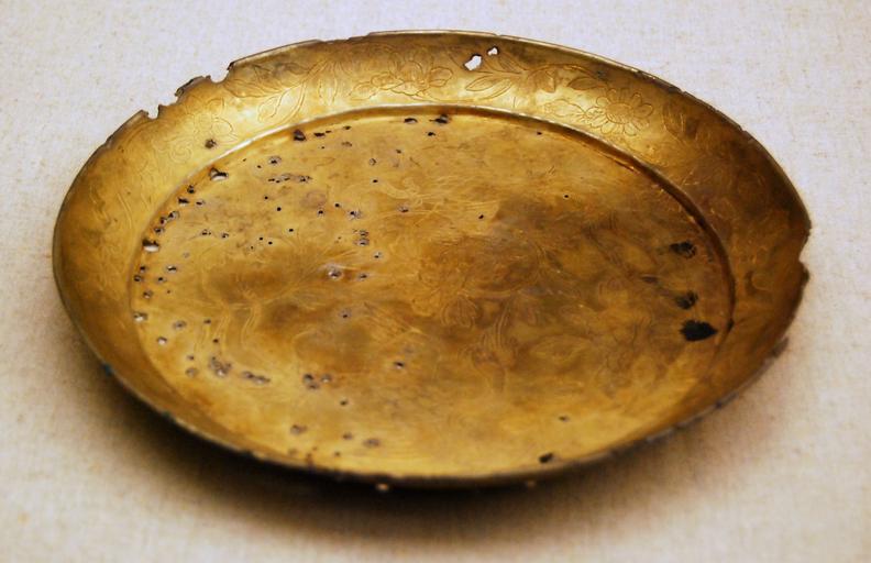 Keywords: Gilt silver dish.JPG en Gilt silver dish zh 鎏金银盘,出自明 皇后棺内 明神宗定陵出 ,明十三陵博物馆藏 2011-10-06 own Shizhao cc-zero Uploaded with UploadWizard Ming tombs Metalwork dishes