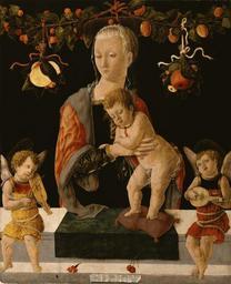 | Keywords: Giorgio di Tomaso Schiavone - Madonna and Child with Angels - Walters 371026.jpg In this altarpiece the Virgin Mary wears gold brocade with pearls and the Christ Child with his necklace of red coral stands on a tasseled cushion Through these precious materials the painter has communicated the divinity of the figures On the parapet at the bottom of the painting is a carnation Its Greek name dianthus means flower of God Schiavone was born in Dalmatia present-day Croatia and immigrated to northern Italy where he studied with Francesco Squarcione of Padua On the cartellino little paper in the foreground he proudly identifies himself as the disciple of this master Like his contemporaries Schiavone was concerned with reviving the arts of antiquity as seen by the garlands at the top that imitate Roman sarcophagus reliefs Zeri Italian paintings in the Walters Art Gallery 138 206-207 between 1459 1460 Renaissance oil on panel Painted surface cm 69 56 7 ; Panel cm 70 56 7 2 5 accession number 37 1026 3259 Arnold Seligmann Rey and Co Munich and New York 1922 listed in Zeri Italian Paintings in the Walters Art Gallery I as A S Drey Robert Lehman New York 1924 mode of acquisition unknown Arnold Seligmann Rey and Co New York 1925 Henry Walters city Baltimore Walters Art Museum Henry Walters Acquired by Henry Walters 1925 HOC PINXIT GEORGIVS DALMATICVS DIS CIPVLVS SQVARCIONI S ; Giorgio Dalmaticus pupil of Squarcione painted this A Renaissance Gem Revealed Petrarch's Triumphs Disbound The Walters Art Museum Baltimore 2002 place of origin Padua Walters Art Museum license ImageNote 1 552 1736 351 57 1461 1799 2 HOC PINXIT GEORGIVS DALMATICVS DIS CIPVLVS SQVARCIONI S ; Giorgio Dalmaticus pupil of Squarcione painted this ImageNoteEnd 1 Paintings in the Walters Art Museum Italian Renaissance paintings in the Walters Art Museum Giorgio di Tomaso Schiavone Paintings of Madonna and Child Madonna with carnations or cloves Virgin Mary with fruits |