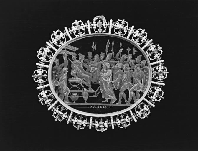 | Keywords: Giovanni Bernardi - Plaque with Christ before Pilate - Walters 41240.jpg This work may be from a set of engraved rock crystal plaques depicting the life of Christ that according to the writer Giorgio Vasari Giovanni Bernardi completed in 1547 for Cardinal Alessandro Farnese 1520-89 They were probably intended to be set into a casket by another craftsman Bernardi was one of the most famous rock crystal engravers of the Renaissance This plaque-with its closely packed relief-like arrangement oval shape and tightly drawn figures-points to his familiarity with Roman intaglio carving on gems The artist signed the plaque with his first name in Latin and F short for fecit made this ca 1547 Renaissance rock crystal gold frame with enamel pearls and rubies cm 10 12 accession number 41 240 23974 Cook date and mode of acquisition unknown Cook Sale July 1925 no 469 Sadie Jones Mrs Henry Walters New York date and mode of acquisition unknown Mrs Henry Walters Sale New York December 4 1943 no 996 Walters Art Museum 1943 by purchase Museum purchase with funds provided by the S and A P Fund 1943 Translation Giovanni F The Taste of Maryland Art Collecting in Maryland 1800-1934 The Walters Art Gallery Baltimore 1984 place of origin Rome Italy Walters Art Museum license Renaissance applied arts in the Walters Art Museum Giovanni Bernardi Rock crystal objects Media contributed by the Walters Art Museum needs category review Christ before Pilate |