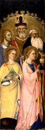 | Keywords: Giovanni del Biondo - Five Saints - Walters 37719.jpg Four of these saints are recognizable by their attributes Sebastian by his arrows Anthony Abbot by his staff Margaret by her dragon and Lucy by her burning lamp The fifth is a bishop as indicated by his miter; his crozier is incised directly into the gold leaf above Anthony Abbot's head While three of the saints face toward what would have been the altarpiece's main panel two turn their gaze outward By directing the gaze of selected figures towards the worshiper the painter made the saints appear more attentive to the needs of those who looked to them for help and protection For more information on this panel please see Zeri catalogue number 10 pp 17-18 between 1370 1379 Medieval tempera and gold leaf on panel Painted surface cm 123 2 44 1 2 accession number 37 719 26136 Marquess Filippo Marignoli Rome and Spoleto until 1898 mode of acquisition unknown Marquess Francesco Marignoli 1898 mode of acqusition unknown Don Marcello Massarenti Collection Rome 1899 1900 catalogue supplement no 26 attributed to Simon Memmi Henry Walters city Baltimore Walters Art Museum 1931 by bequest Acquired by Henry Walters with the Massarenti Collection 1902 place of origin Florence Italy Walters Art Museum license 2D Medieval art in the Walters Art Museum Giovanni del Biondo Croziers in art Paintings in the Walters Art Museum |