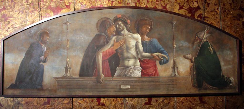 Keywords: Giovanni e gentile bellini, pietà, 1472, 01.JPG Art photo Creator Giovanni Bellini en Madonna and Saint John the Evangelist supporting the dead Christ They are flanked by Saint Mark the Evangelist at the left and Saint Nicholas at the right In 1571 the painting was enlarged by Paolo Farinati by putting the scene into a Veronese style landscape In 1948 the original compisition was restored 1472 Tempera on canvas size cm 115 317 Institution Palazzo Ducale Venice Sala dell'Avogaria de Comùn http //www wga hu/html/b/bellini/giovanni/1470-79/065pieta html Web Gallery of Art object history credit line accession number artwork license PD-old-100-1923 photo date 2014-01-25 13 00 06 own Sailko photo license cc-by-3 0 Supported by Wikimedia CH Images by Sailko - Supported by Wikimedia CH DEFAULTSORT Bellini Giovanni and Gentile; Pietà; Dodge's Palace Sala dell'Avogaria de Comùn Pietà by Giovanni and Gentile Bellini 15th-century paintings of Saint Mark 15th-century paintings of Saint Nicholas Paintings of Saint Mark in Italy Paintings of Saint Nicholas in Italy Photographs by User Sailko |