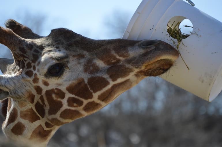 Keywords: giraffe zoo animal mammal cute park neck head feed bucket