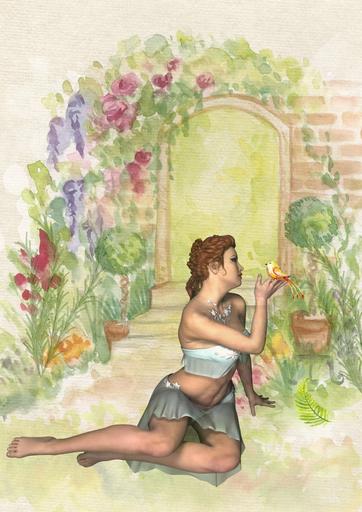 Keywords: girl bird door garden watercolor fairytale hand science fiction flower magical fantasy cute magic tale dream woman mystery fairy tale outdoor story imagination light mysterious surreal wood leaves enchanted imagine colorful bright romantic composition creative