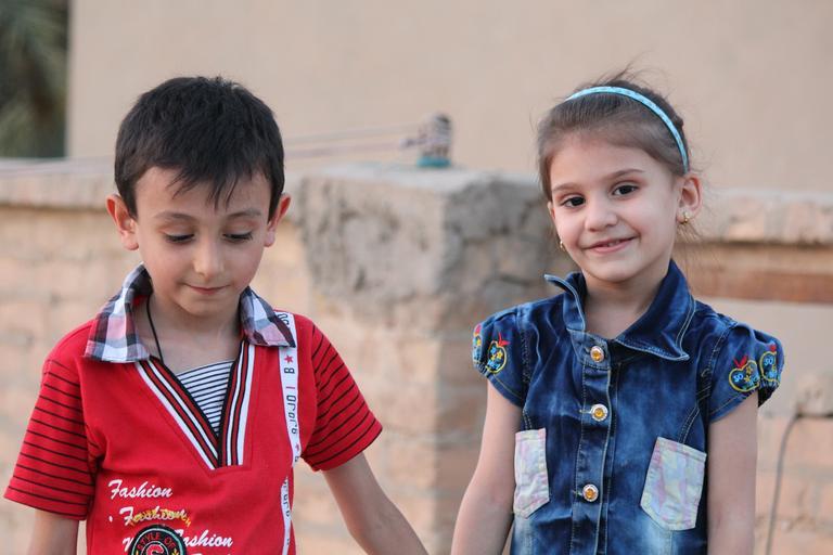 Keywords: girl boy together kids cute hair sunlight arab young child iraq