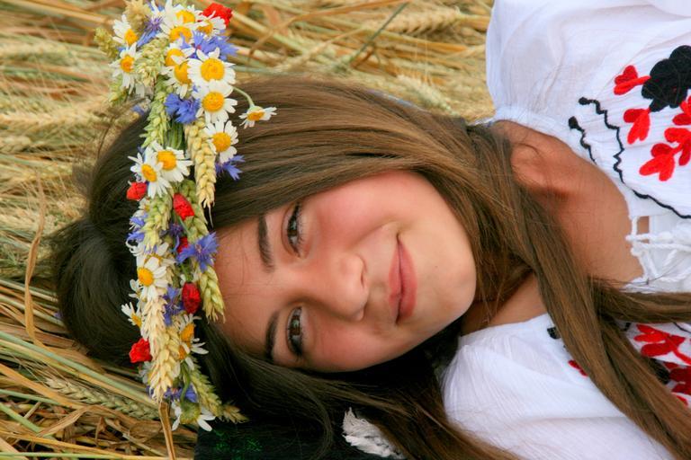 Keywords: girl child peasant woman traditional suit wreath summer grau