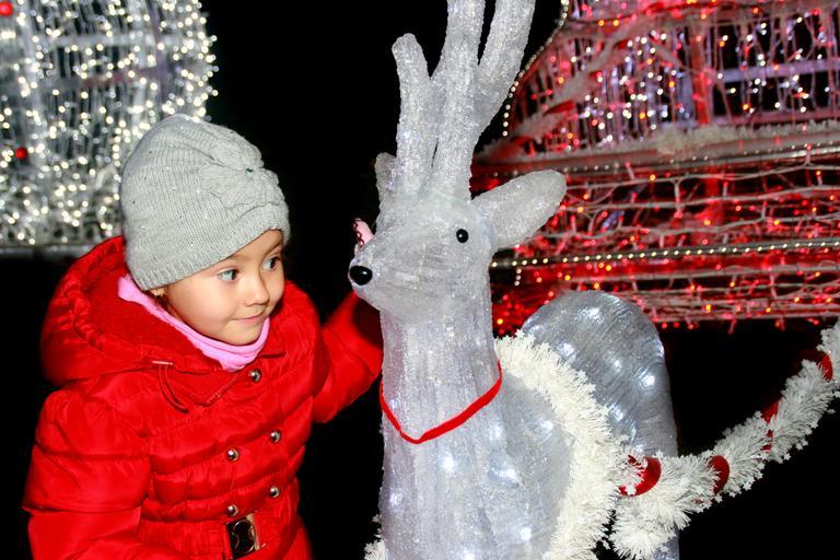 Keywords: girl christmas holidays winter reindeer lights child joy red decoration
