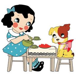 Keywords: girl dog tea party child little puppy doggy cartoon cute whimsical art pet happy female animal friendship fun childhood smiling friend kid smile scrapbooking card template