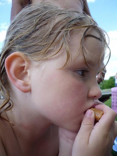 Keywords: girl eat nibble swim summer wet hair child hunger face
