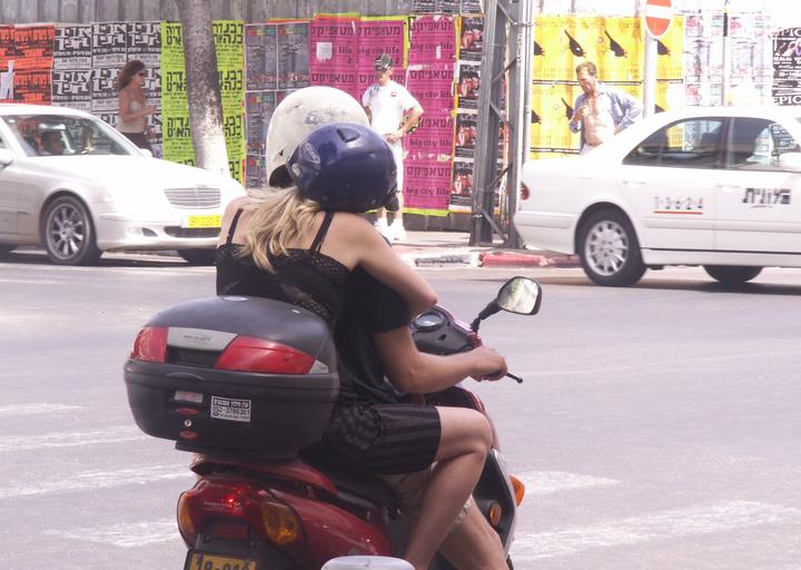 Keywords: girl hugging guy helmet motorcycle scooter street tel aviv red light blond moped billboards urban city love romantic hug