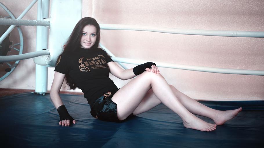 Keywords: girl in the ring in the blinders beautiful boxing muay thai female sports photo long hair girl model photoshoot hair legs body view kickboxing training apparatus girl in the gym girl in a vest athletic girl thai boxing gloves eyes