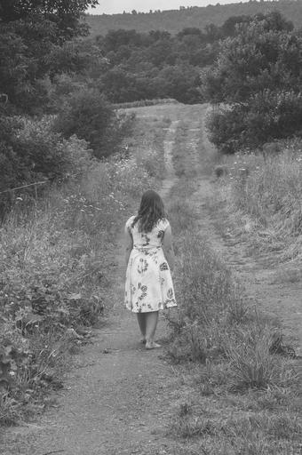 Keywords: girl path wander walk female nature young person summer lifestyle walking trees outside field lane dress long hair barefoot landscape calm solitude people relax alone outdoors leisure rural