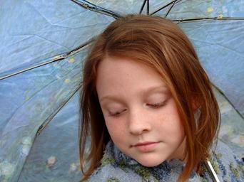 Keywords: girl pensive rain umbrella young youth portrait solitude face expression emotion hair redhead