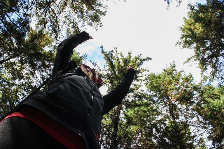 Keywords: girl person hands up happy love journey destiny life joy forest trees woods nature hiker trek sky