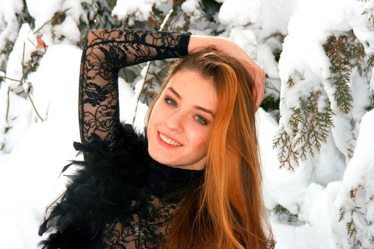 Keywords: girl portrait green eyes blonde snow winter black lace
