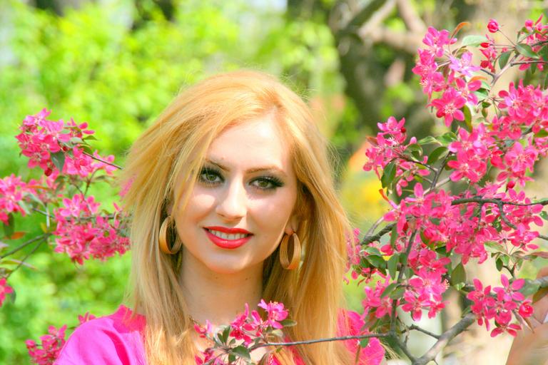 Keywords: girl portrait pink flowers tree seduction smile beauty blonde