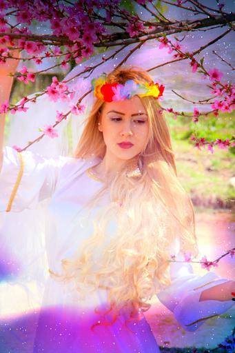 Keywords: girl princess spring blond hair dress portrait beauty flowers tree woman story