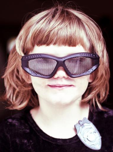 Keywords: girl silly kid childhood cheerful pretty laughing smile glasses dress up humor happiness family brunette mask costume play