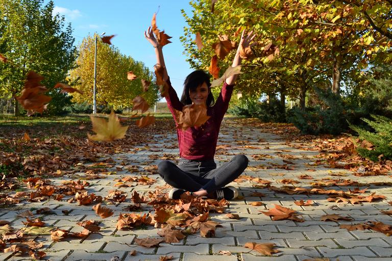 Keywords: girl stone fall autumn leaves orange yellow forest nature park foliage golden october outdoors joy happiness life