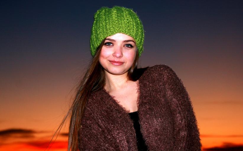 Keywords: girl sunset in the evening green eyes hat sky green cold portrait beauty