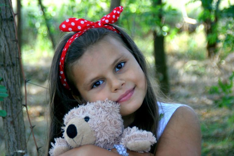 Keywords: girl tedddy bear teddy bear bow smile child beauty red bow innocence princess dress white
