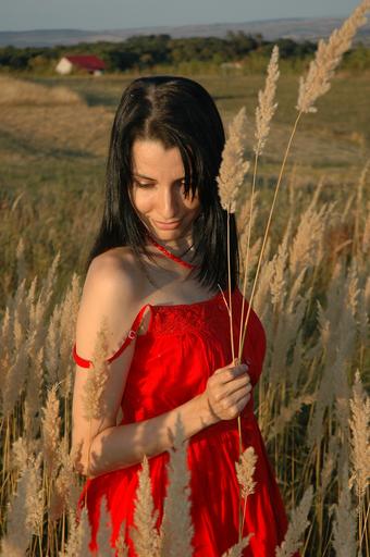 Keywords: girl woman female nature red dress field young lady black hair