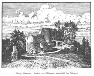 Keywords: GL05 Liebenstein Zwinger.jpg en The ruins of Liebenstein castle de Die Ruine der Burg Liebenstein Voss Georg Hrsg Herzogthum Sachsen-Meiningen Kreis Meiningen Amtsgerichtsbezirk Salzungen In Lehfeldt Paul/Voss Georg Hrsg Bau- und Kunst-Denkmäler Thüringens Heft XXXV Jena 1909 S 85 Georg Lilie 1873 -1935 1905 Eingescannte Grafik PD-old Georg Lilie Burg Liebenstein Bad Liebenstein ImageNote 1 167 862 872 43 1116 911 2 Burg Liebenstein Ansicht von Südwesten ausserhalb des Zwingers ImageNoteEnd 1 ImageNote 2 32 783 115 32 1116 911 2 G LILIE 05 ImageNoteEnd 2 |