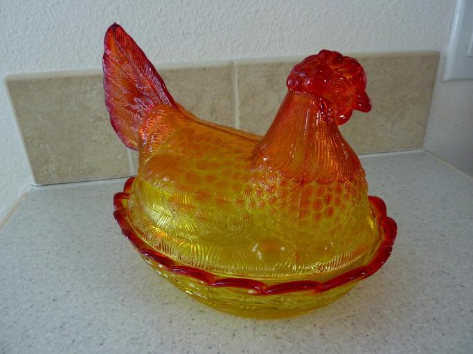Keywords: glass chicken chicken dish carnival glass food dish mold kitchen collectable decoration dishes design orange colorful display glassware cut glass hen