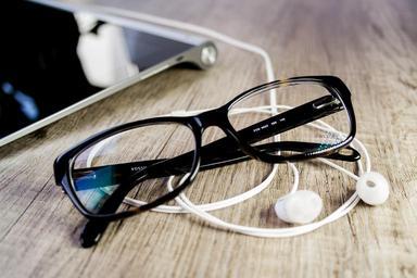 Keywords: glasses tablet office touch screen reading glasses workplace business music headphones leisure youth relax hobby happy human feelings sun summer sunglasses warm light technology optics listen wood cozy time benefit from casual woman man