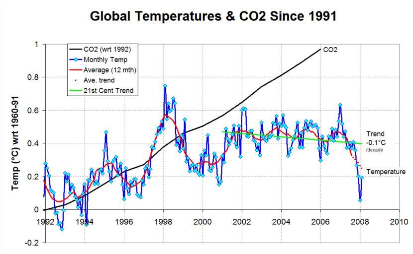 | Keywords: GlobalTemperaturesSince1991.png This figure shows the Monthly global temperatures after the 1960-1991 average The data for temperature is relative to the 1960-91 average as is as given by Hadcrut3 http //hadobs metoffice com/hadcrut3/diagnostics/global/nh 2Bsh/monthly the average temperature is a rolling average of 12 months Carbon dioxide concentrations are yearly averages taken from http //www esrl noaa gov/gmd/ with scale adjusted so that 1992 is zero The primary reason for uploading the file is as a visual aid to highlight that recent trend has been for cooling and so prompt a discussion about the use of phrases such as recent warming The CO<sub>2</sub> scale ranges from a low value of 356 ppm to a high of 382 ppmftp //ftp cmdl noaa gov/ccg/co2/trends/co2_annmean_mlo txt Transferred from http //en wikipedia org en wikipedia; transferred to Commons by User SchuminWeb using http //tools wikimedia de/~magnus/commonshelper php CommonsHelper 2008-02-20 Original uploader was Isonomia at http //en wikipedia org en wikipedia Released into the public domain by the author en wikipedia Isonomia Original upload log page en wikipedia GlobalTemperaturesSince1991 png 2008-03-15 10 11 Isonomia 1076×664× 46975 bytes <nowiki></nowiki> 2008-02-20 19 41 Isonomia 977×600× 42442 bytes <nowiki>This figure shows the Monthly global temperatures after the 1960-1991 average The data for temperature is relative to the 1960-91 average as is as given by Hadcrut3 http //hadobs metoffice com/hadcrut3/diagnostics/global/nh 2Bsh/monthly the average te</nowiki> Global warming graphs Line charts Diagrams in English |