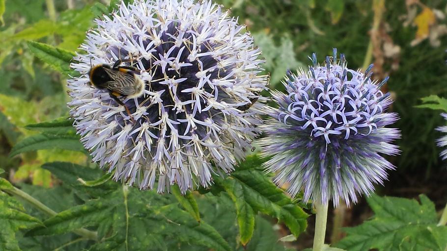 Keywords: globe thistle bee flower insect pollination nectar thistle purple flowers