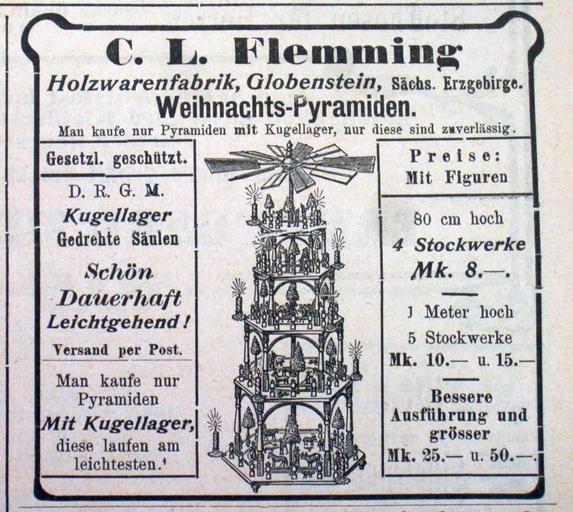Keywords: Globensteiner Pyramiden 1.jpg de Die Globensteiner Pyramide ist eine Besonderheit Im Erzgebirge entstanden Pyramiden meistens als Einzelstücke die geschickte Männer neben ihrem Beruf konstruierten und bauten eher als Freizeitbeschäftigung oder um etwas hinzu zu verdienen Die Firma Carl Ludwig Flemming in Globenstein bei Schwarzenberg stellte Produkte wie Handwagen und Kleinmöbel her Um 1900 entwickelte sie ein Pyramidensystem für das sie kleine Holzreste aus der Hauptproduktion verwenden konnte Die Konstruktion erlaubte daß Pyramiden unterschiedlicher Höhe angeboten die Flügel seitlich in die Böden gesteckt und die Kerzenhalter hochgeklappt werden konnten Für ihr Serienprodukt das es mit und ohne Figuren gab warb sie in vielen Zeitungen Sie verschickte ihre Pyramiden in pyramidenförmigen Kartons mit der Post in guten Zeiten über 5000 Stück im Jahr Mit und ohne Geläut mit und ohne Figuren - ganz nach Bestellung Die Figuren können nach Belieben auf die Teller gestellt werden - Anzeige im Schönheider Wochenblatt im Dezember 1904 own Klaaschwotzer 2013-12-02 Historical documents of Schönheide Ore Mountain folk art Breitenbrunn/Erzgeb Globensteiner Weihnachtspyramide Schönheider Wochenblatt Cc-zero |
