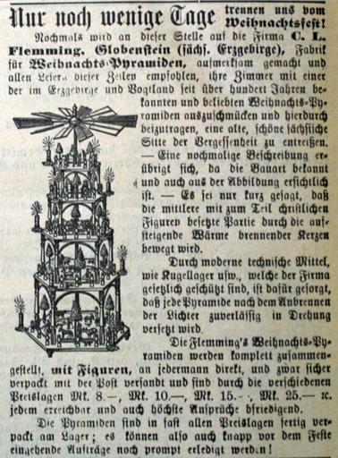 Keywords: Globensteiner Weihnachtspyramide 1.jpg de Die Globensteiner Weihnachtspyramide die die Firma Carl Ludwig Flemming in Globenstein bei Schwarzenberg/Erzgebirge von etwa 1900 bis 1948 herstellte ist eine Besonderheit Im Erzgebirge entstanden Weihnachtspyramiden meistens als Einzelstücke die geschickte Männer neben ihrem Beruf konstruierten und bauten eher als Freizeitbeschäftigung oder um durch den Verkauf der Weihnachtspyramide etwas hinzu zu verdienen Zur Produktpalette der Firma C L Flemming gehörten im wesentlichen Holzartikel wie Hobelbänke Haus- und Küchengeräte Vogelkäfige Handwagen und Kleinmöbel Um 1900 entwickelte sie ihre Weihnachtspyramiden als Modulsystem für das sie auch Holzreste aus der Hauptproduktion verwenden konnte Die Konstruktion erlaubte daß Weihnachtspyramiden unterschiedlicher Höhe angeboten werden konnten Die Flügel konnten senkrecht an den Seiten in die Böden gesteckt und die Kerzenhalter hochgeklappt werden Dies machte einen Versand in Kartons mit platzsparender Verpackung möglich Der Transportkarton eignete sich auch zum Aufbewahren der Weihnachtspyramide wenn sie nicht verwendet wurde Für ihr Serienprodukt das es mit und ohne Figuren sowie mit und ohne Geläut gab warb sie in vielen Zeitungen Sie verschickte ihre Weihnachtspyramiden in Kartons mit der Post in guten Zeiten über 5000 Stück im Jahr - Hier ein redaktioneller Bericht der eine Anzeige der Firma C L Flemming im Schönheider Wochenblatt vom Dezember 1909 begleitete Es wird herausgestellt daß diese Weihnachtspyramiden auch noch kurz vor Weihnachten bestellt und rechtzeitig vor Weihnachten den Bestellern geliefert werden könnten Diese Zeitung erschien von 1876 bis 1941 dienstags donnerstags und sonnabends im Frühjahr 1945 nach der Beendigung des Zweiten Weltkriegs und erneut seit Dezember 1989 freitags own Klaaschwotzer 2014-01-20 Ore Mountain folk art Breitenbrunn/Erzgeb Historical documents of Schönheide Globensteiner Weihnachtspyramide Schönheider Wochenblatt Cc-zero |