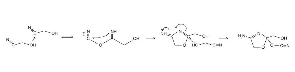 Keywords: Glycolonitrile polymerisation.svg en Reaction mechanism of the polymerisation of glycolonitrile after Arrhenius et al J Org Chem Vol 62 No 16 1997 own Hermann Luyken 2010-07-10 Glycolonitrile