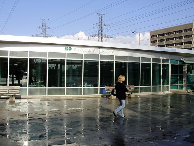 Keywords: GO Finch Bus Terminal.jpg en The main facade of the GO Transit Finch Bus Terminal viewed from one of the passenger loading areas at the intersection of Yonge Street and Bishop Avenue in North York Ontario own GTD Aquitaine 2008-05-31 Finch Bus Terminal |