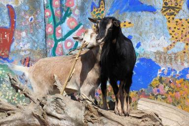Keywords: goat grafitti tree trunks sun petting zoo