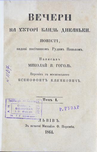 ΡΡΠΎΡ i Π±Π»ΠΈΠ·Ρ ΠΠΈΠΊΠ°Π½ΡΠΊi ΠΡΠ²ΡΠ² 1864 Π’ΠΈΡΡΠ»ΡΠ½ΠΈΠΉ Π°Ρ ΠΊΡΡ Π ΠΎΡΠΎΠ±ΠΈΡΡΠΎΡ Π±ΡΠ±Π»ΡΠΎΡΠ΅ΠΊΠΈ Π Π€Ρ Π°Π½ΠΊΠ° M Gogol/ Dikanka Evenings Lviv 1864 From Ivan Franko personal Library 18864 Institution Shevchenko Institute of Literature Digital Collection PD-old-70-1923 Books published in Lviv Franko Personal Library Collections of books in libraries in Ukraine Shevchenko Institute of Literature Uploaded with VicuΓ±aUploader |