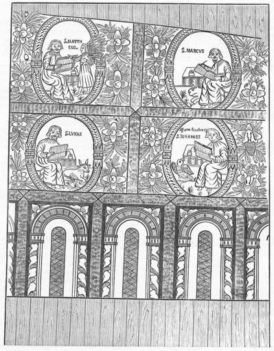 Keywords: Gol-choir-evangelists.png Picture taken from Gols gamle Stavkirke og Hovestuen <br/> paa<br/> Bygdø Kongsgaard <br/> Med Illustrationer <br/> uddeles<br/> som gave fra Hans Majestæt Kongen <br/> Christiania 1885 PD-old Gol stavkirke