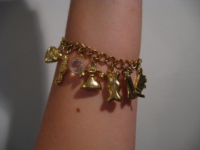 Keywords: Gold charm bracelet.JPG en A gold charm bracelet worn on the arm Visible charms are a heart-shaped locket seahorse crystal telephone bear spaceship and grand piano own Mabsal 2009-12-27 Public Domain Bracelets Charm bracelets Heart shapes in jewellery |