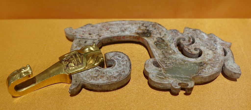 | Keywords: Gold hook buckle with jade dragon, Western Han dynasty, from the mausoleum of Nanyue King Zhaomo, Xianggang, Guangzhou - Hong Kong Museum of History - DSC00846.JPG en Exhibit in the Hong Kong Museum of History Hong Kong This artwork is old enough so that it is in the public domain Photography was permitted in the museum without restriction 2014-07-27 01 46 16 own Daderot other versions PD-100 cc-zero Metalwork of China in the Hong Kong Museum of History Uploaded with UploadWizard | ||||
