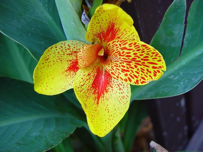 | Keywords: Gold and red flower dark green leaves.jpg en <br/> Image title Gold and red flower dark green leaves Image from Public domain images website http //www public-domain-image com/full-image/flora-plants-public-domain-images-pictures/flowers-public-domain-images-pictures/gold-and-red-flower-dark-green-leaves jpg html http //www public-domain-image com/public-domain-images-pictures-free-stock-photos/flora-plants-public-domain-images-pictures/flowers-public-domain-images-pictures/gold-and-red-flower-dark-green-leaves jpg Leon Brooks Not given Transferred by Fæ on 2013-03-01 This file is in public domain not copyrighted no rights reserved free for any use You can use this picture for any use including commercial purposes without the prior written permission and without fee or obligation PD-author Leon Brooks Images uploaded by Fæ Public-domain-image com Canna × generalis Speckled flowers Red and yellow flowers |