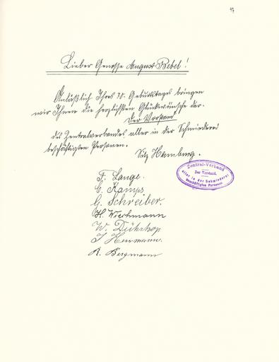 | Keywords: Goldenes Buch zum 70. Geburtstag August Bebel 1910 Seite 097.jpg Goldenes Buch zum 70 Geburtstag August Bebel 1910 Seite_ jpg 096 098 Glückwunschschreiben zum 70 Geburtstag von August Bebel Zentralverband aller in der Schmiederei beschäftigten Personen August Bebel zum siebzigsten Geburtstag 22 Februar 1910 / mit einer Nachbemerkung von Ursula Herrmann Reprint des Unikats aus dem Zentralen Parteiarchiv der SED Dietz Verlag Berlin 1989 Lizenzausgabe Saur 1989 ISBN 3-598-07256-2 self scanned from own book 1910 Diverse PD-old-70-1923 Goldenes Buch zum 70 Geburtstag August Bebel 1910 |