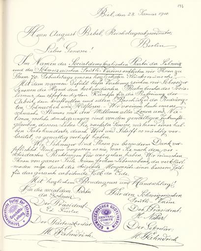 | Keywords: Goldenes Buch zum 70. Geburtstag August Bebel 1910 Seite 137.jpg Goldenes Buch zum 70 Geburtstag August Bebel 1910 Seite_ jpg 136 138 Glückwunschschreiben zum 70 Geburtstag von August Bebel Sozialdemokratische Partei der Schweiz und Grütliverein August Bebel zum siebzigsten Geburtstag 22 Februar 1910 / mit einer Nachbemerkung von Ursula Herrmann Reprint des Unikats aus dem Zentralen Parteiarchiv der SED Dietz Verlag Berlin 1989 Lizenzausgabe Saur 1989 ISBN 3-598-07256-2 self scanned from own book 1910 Diverse PD-old-70-1923 Goldenes Buch zum 70 Geburtstag August Bebel 1910 Grütliverein |