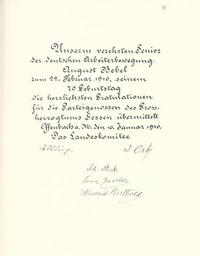 | Keywords: Goldenes Buch zum 70. Geburtstag August Bebel 1910 Seite 039.jpg Goldenes Buch zum 70 Geburtstag August Bebel 1910 Seite_ jpg 038 040 Glückwunschschreiben zum 70 Geburtstag von August Bebel SPD-Landeskomitee Hessen August Bebel zum siebzigsten Geburtstag 22 Februar 1910 / mit einer Nachbemerkung von Ursula Herrmann Reprint des Unikats aus dem Zentralen Parteiarchiv der SED Dietz Verlag Berlin 1989 Lizenzausgabe Saur 1989 ISBN 3-598-07256-2 self scanned from own book 1910 Diverse Goldenes Buch zum 70 Geburtstag August Bebel 1910 PD-old-70-1923 |