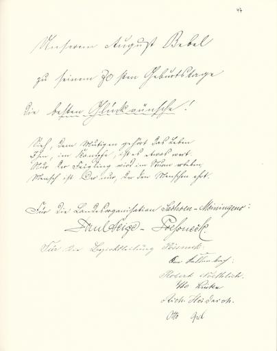 | Keywords: Goldenes Buch zum 70. Geburtstag August Bebel 1910 Seite 047.jpg  Goldenes Buch zum 70 Geburtstag August Bebel 1910 Seite_ jpg 046 048 Glückwunschschreiben zum 70 Geburtstag von August Bebel SPD-Landesorganisation Sachsen-Meiningen August Bebel zum siebzigsten Geburtstag 22 Februar 1910 / mit einer Nachbemerkung von Ursula Herrmann Reprint des Unikats aus dem Zentralen Parteiarchiv der SED Dietz Verlag Berlin 1989 Lizenzausgabe Saur 1989 ISBN 3-598-07256-2 self scanned from own book 1910 Diverse Goldenes Buch zum 70 Geburtstag August Bebel 1910 PD-old-70-1923  |