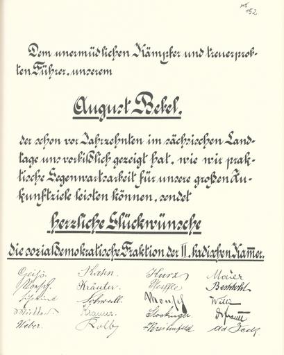 | Keywords: Goldenes Buch zum 70. Geburtstag August Bebel 1910 Seite 152.jpg  Goldenes Buch zum 70 Geburtstag August Bebel 1910 Seite_ jpg 151 153 Glückwunschschreiben zum 70 Geburtstag von August Bebel SPD-Fraktion des Badischen Landtages August Bebel zum siebzigsten Geburtstag 22 Februar 1910 / mit einer Nachbemerkung von Ursula Herrmann Reprint des Unikats aus dem Zentralen Parteiarchiv der SED Dietz Verlag Berlin 1989 Lizenzausgabe Saur 1989 ISBN 3-598-07256-2 self scanned from own book 1910 Diverse Goldenes Buch zum 70 Geburtstag August Bebel 1910 PD-old-70-1923 |